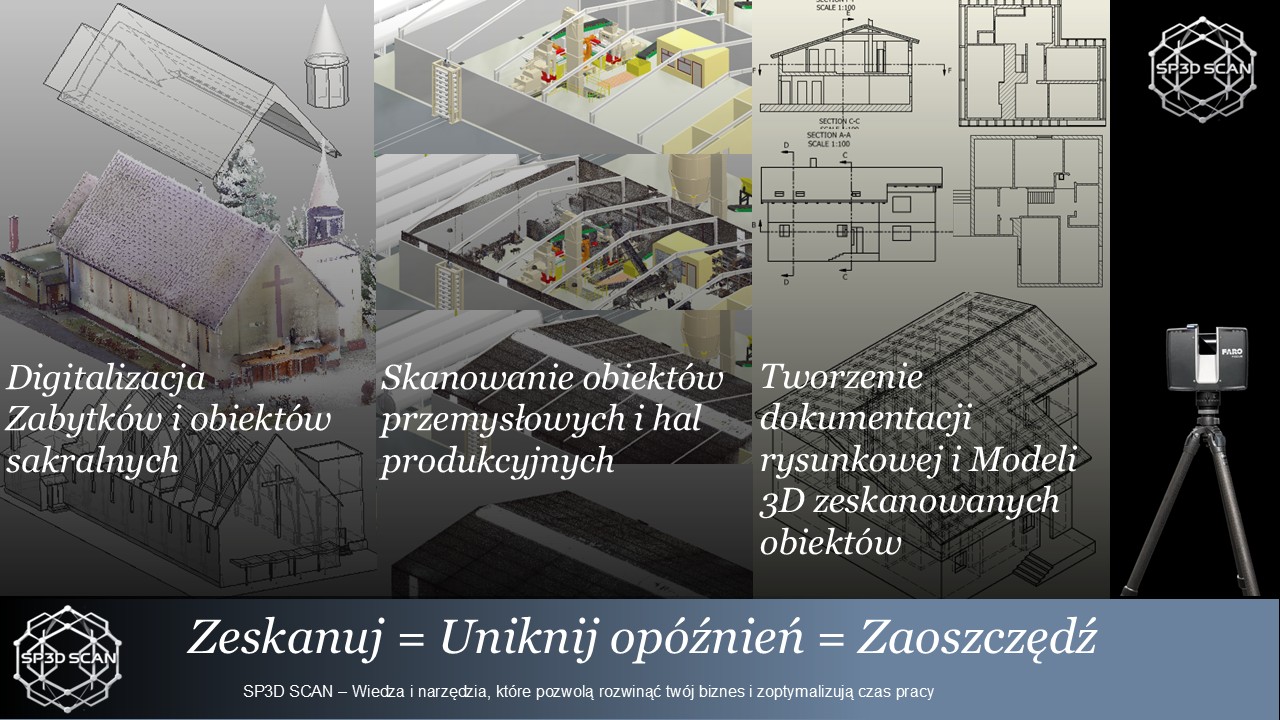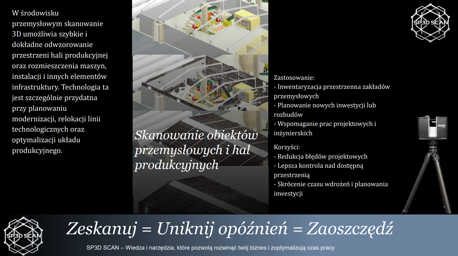 oferuje kompleksowe usługi skanowania 3D i dokumentacji technicznej dla obiektów przemysłowych, budynków mieszkalnych, zabytków i przestrzeni publicznych. Wykonujemy inwentaryzacje budowlane zgodne z normą PN-ISO 9836:2022-07, tworzymy modele BIM i CAD, rzuty 2D oraz dokumentację fotograficzną. Dzięki precyzyjnemu pomiarowi laserowemu dostarczamy dane niezbędne do projektowania, modernizacji i archiwizacji. Nasze rozwiązania są bezinwazyjne, szybkie i zgodne z wymaganiami instytucji urzędowych i konserwatorskich. Działamy na terenie całej Polski, dostarczając gotowe materiały w formatach cyfrowych i papierowych.